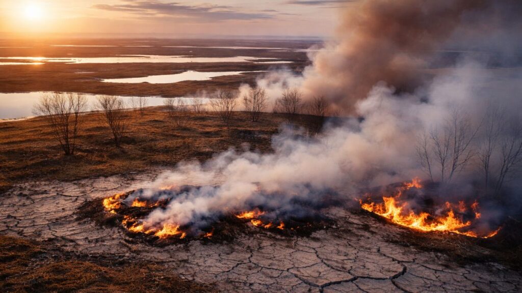Across Canada’s far north, warming temperatures are awakening a process scientists have feared for years. As frozen soil softens, ancient plant matter begins to decompose, generating heat that can ignite subsurface smoldering without visible flames. These slow-burning events release massive amounts of carbon while remaining difficult to detect or control. Researchers warn that deep soil heat can persist through winter, re-emerging in warmer months. This creates a dangerous cycle where thaw leads to fire, and fire leads to more thaw. The result is a landscape that changes quietly but rapidly, putting permafrost stability loss and nearby infrastructure at serious risk.
